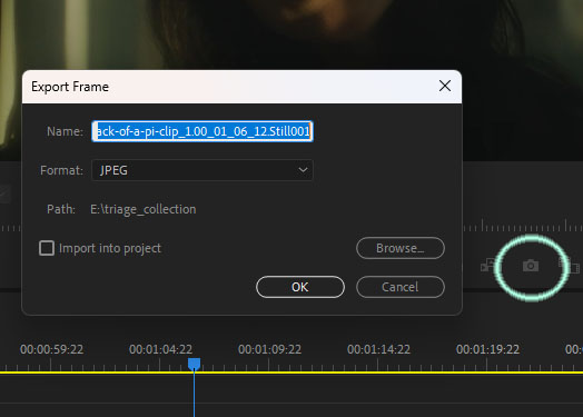 בחלון הפרוגרם ישנו כפתור עם אייקון של מצלמה דרכו ניתן לייצא פריים בודד. מגדירים את סוג הקובץ ואת המיקום לשמירה.