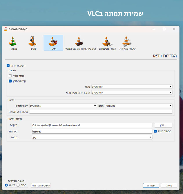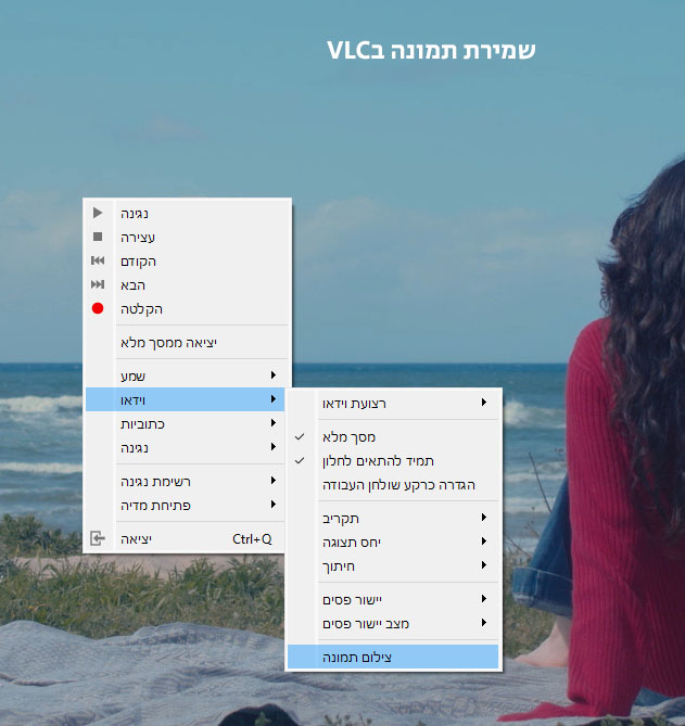 - ואז כשמנגנים את קובץ הוידאו אפשר בלחיצה ימנית לבחור -וידאו ו->שמירת תמונה.
