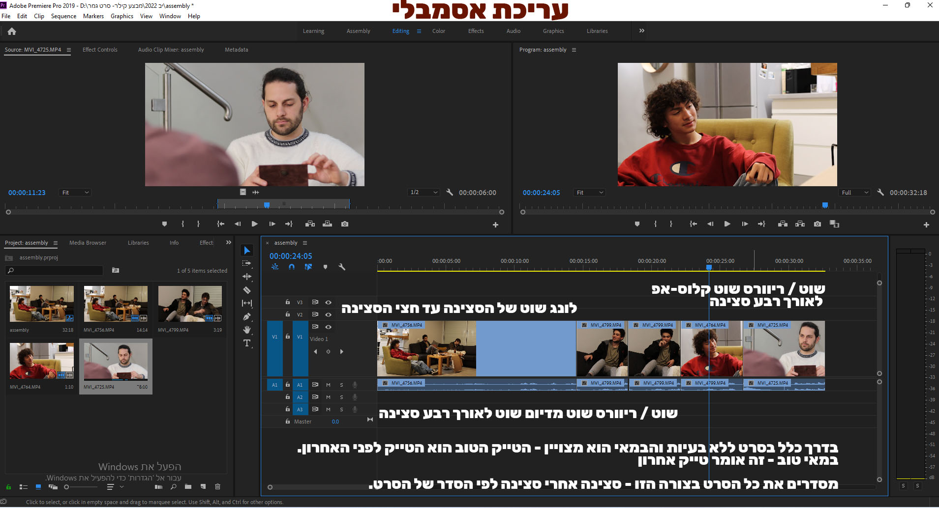 - חיתוך ועריכה: העורך יחתוך ויערוך את קטעי הוידאו והאודיו לפי הסדר הבא:
