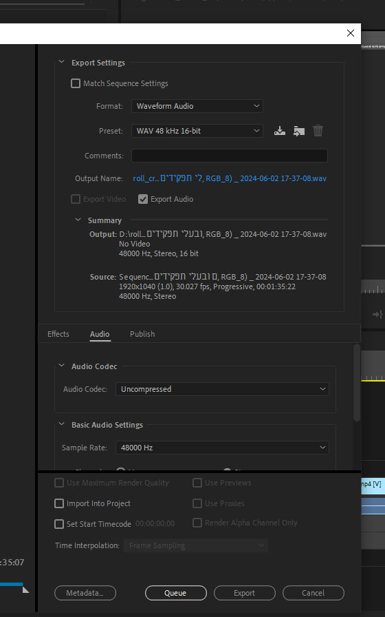 בהגדרות הייצוא יש לבחור בפורמט waveform audio.