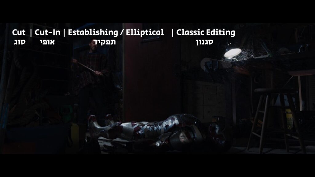 - רציפות (Continuity Editing): יצירת רצף חלק והגיוני של שוטים כך שהצופה יוכל לעקוב אחרי הסיפור בלי להיות מבלבל. זה כולל התאמה של כיווני מבט, מיקום הדמויות והפעולות שלהן בין השוטים.