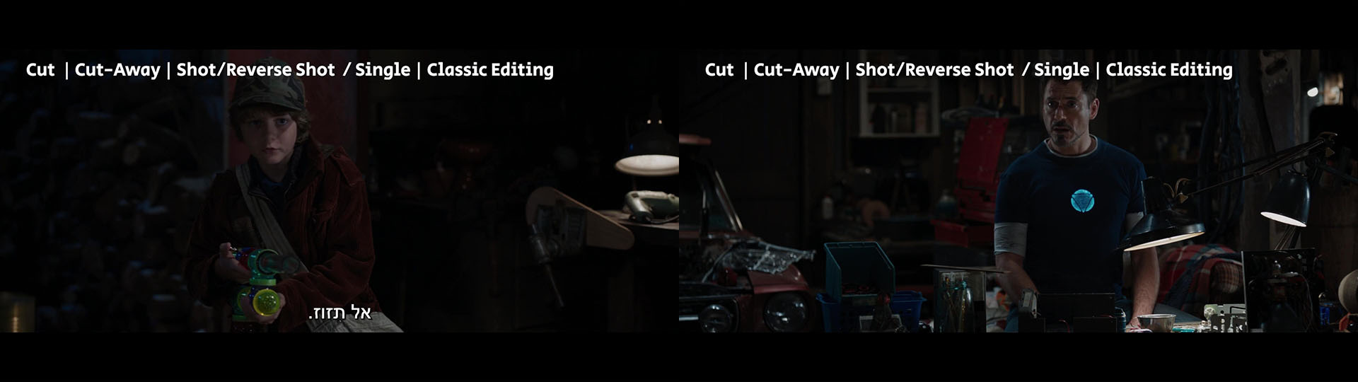- חיתוך לפי מבט (Eyeline Match): התאמה של קווי המבט של הדמויות כך שהצופה יבין לאן הדמות מסתכלת ומה היא רואה.