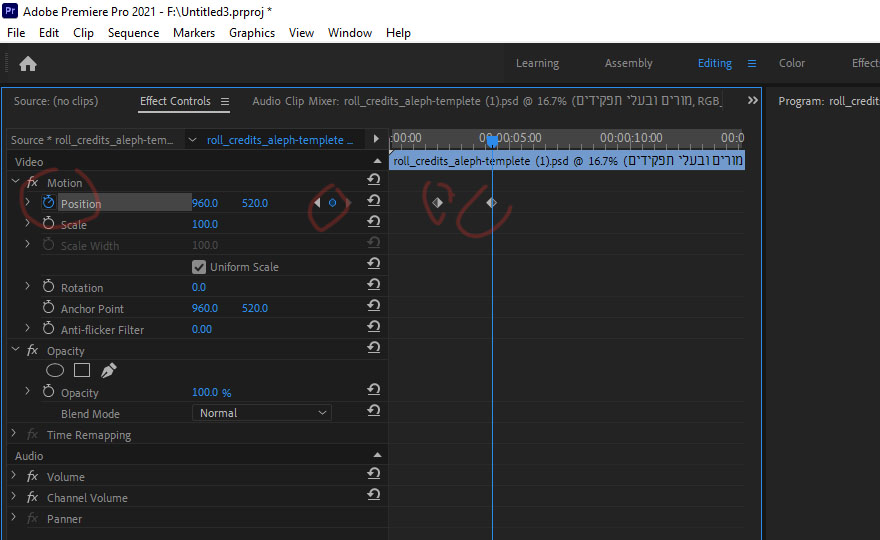 - הגדרת קי פריים ראשון: בחר את האובייקט או קטע הוידאו שברצונך להנפיש. הגדר את ערכים התחלתיים של הפרמטרים שברצונך לשנות (לדוגמה, מיקום האובייקט).