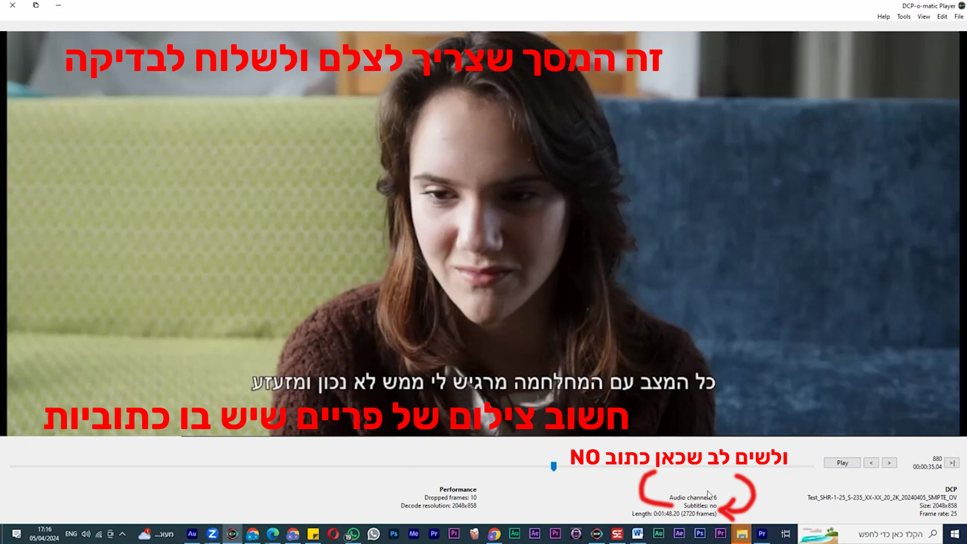 יש גם להעלות תמונת מסך של הסרט בפלייר של DCP. כדי שנוכל לוודא שהכל טוב.