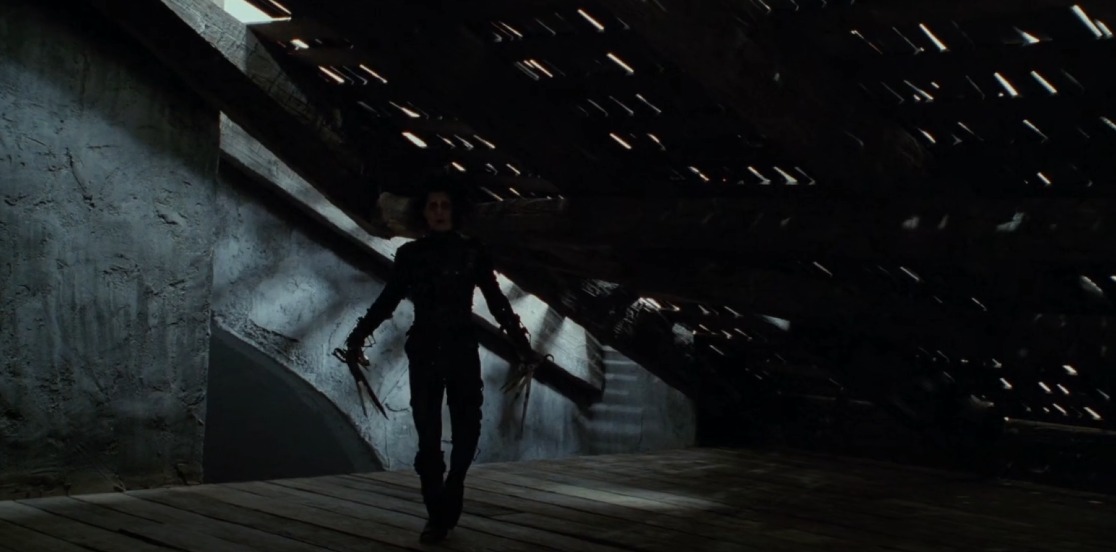 מתוך סצנת המפגש הראשונה בין אדוארד לגיבורה בסרט "המספריים של אדוארד" (Edward Scissorhands), בבימויו של טים ברטון. זוהי דוגמה חזקה לשימוש בבלוקינג (העמדה) כדי לבטא רגש, מבנה עלילתי, ומאפייני דמות.