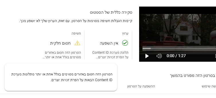 - השוואה אוטומטית: יוטיוב משווה את הסרטון שלך למאגר עצום של סרטונים ותוכן מוגן בזכויות יוצרים. אם נמצאת התאמה משמעותית, המערכת תפעיל את מנגנוני ההגנה על זכויות יוצרים.